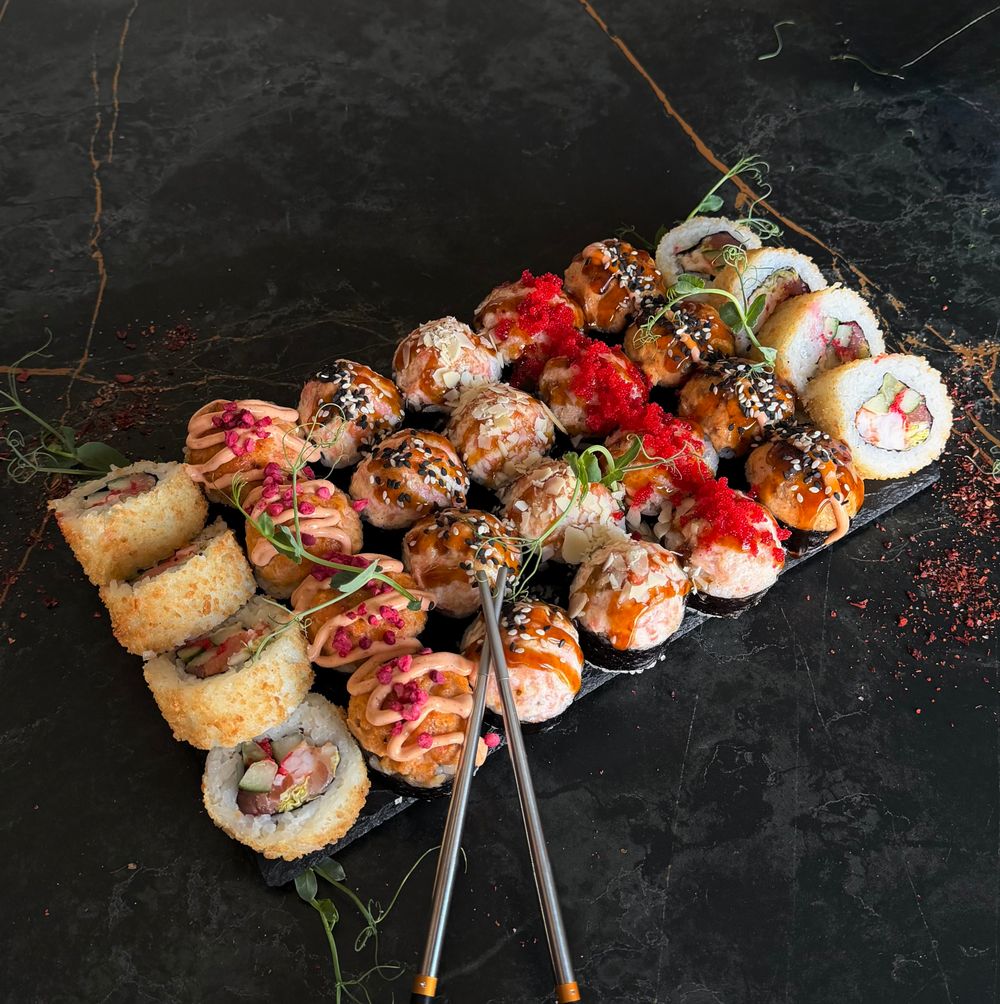 Запеченный ролл с угрем и манго 1/2, Запеченный калифорния Яки 1/2, Запеченный ролл с лососем и трюфельным соусом 1/2, Запеченный ролл с лососем и миндалем 1/2, запеченный ролл том-ям с малиной 1/2, Темпура с морепродуктами